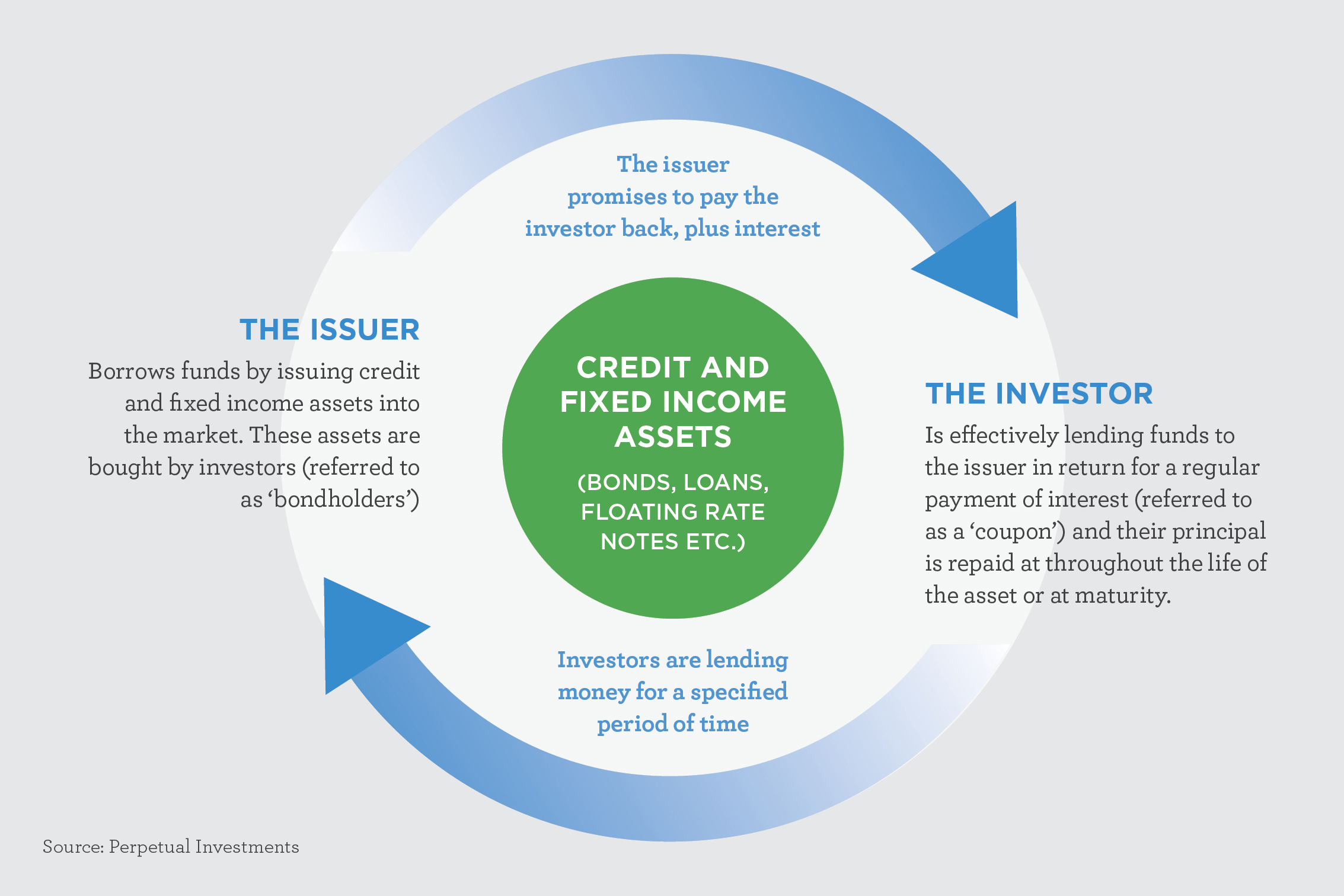 A fixed income investment is a simple interest only loan. It may be made to a government, semi-government authority or company; as such, fixed income investments are often referred to as ‘debt’ investments.