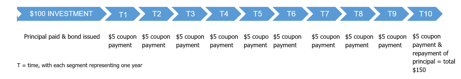 Using a very simplistic example, if an investor bought a 10-year government bond at issue for $100, received an annual coupon of 5%, and held it to maturity, the cashflow would look like this. The investor would receive coupon payment/s each year, totalling 5% and, at maturity, the principal – or loan – is repaid.