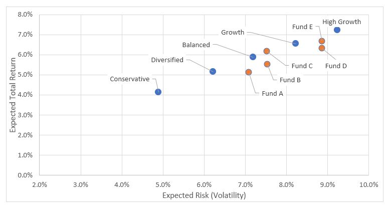 The differing definitions of these funds and their underlying asset allocation can make a significant difference in investment risk vs returns. Let’s look at an asset allocation strategy common in the early years of retirement – the ‘Balanced’ fund.