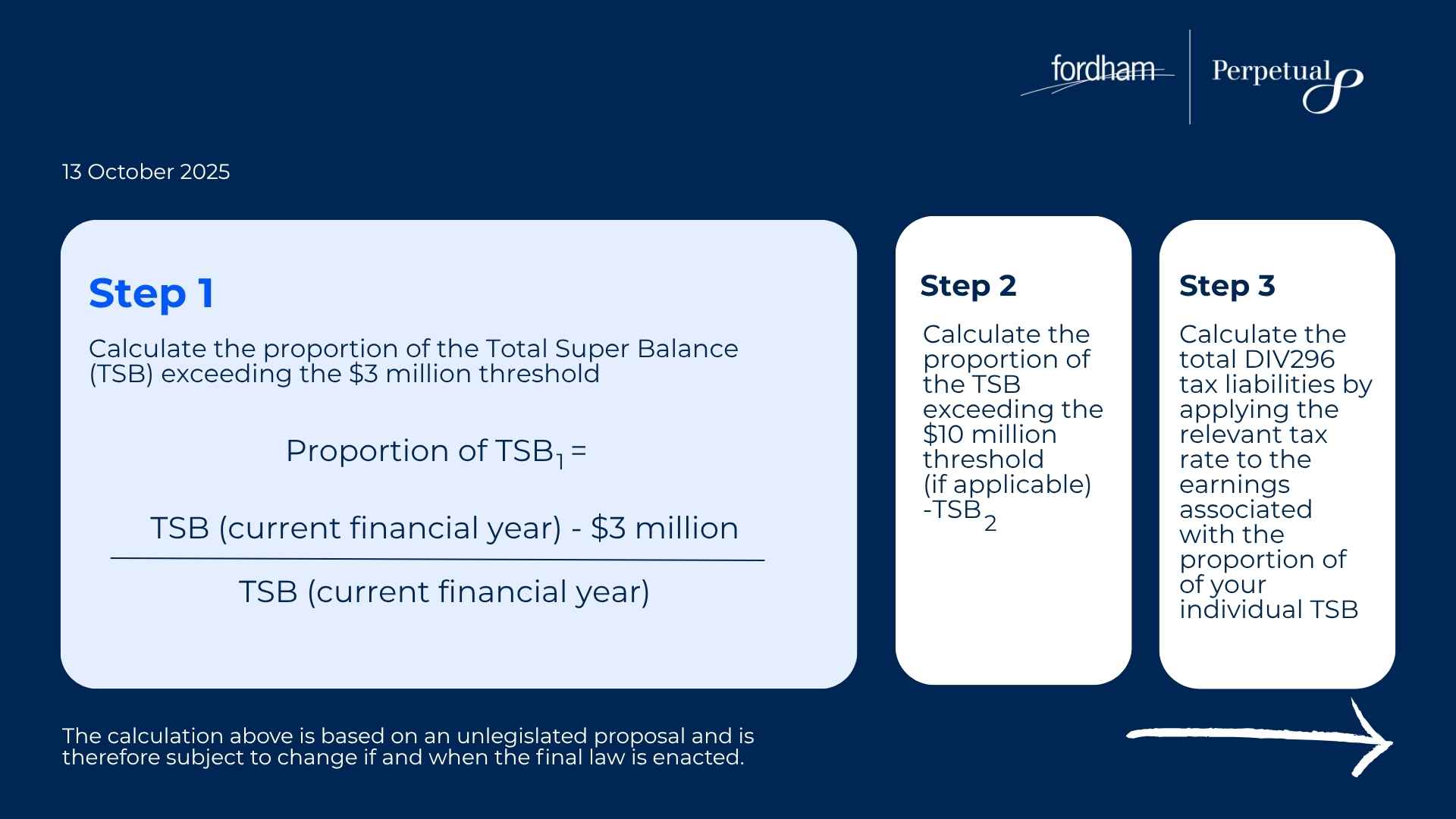 Step 3: Calculate the total Division 296 tax liabilities by applying the relevant tax rate to the earnings associated with the proportion of your individual Total Super Balance (TSB).